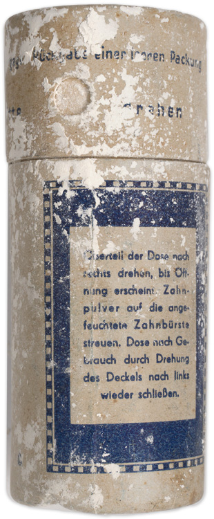 Chlorodont brand, cardboard, two piece container that holds original toothpaste powder. The container measures approximately 10cm x 4cm in diameter. The contents have escaped the container.