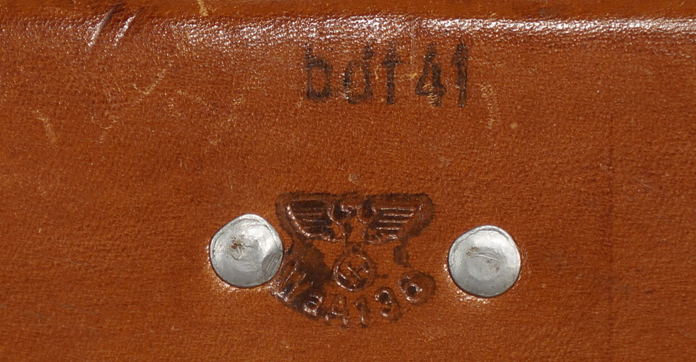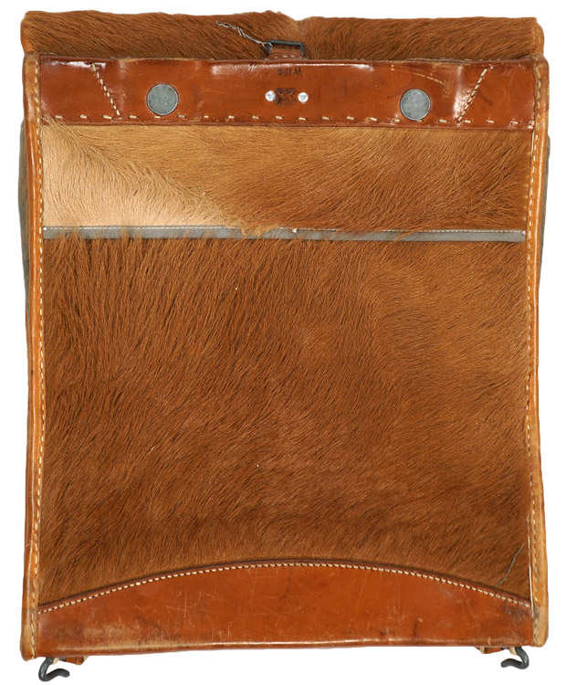 PHYSICAL DESCRIPTION: The pack measures 16" x 13" x 4", and has an internal wooden frame. Its exterior is covered in brown cowhide and is trimmed in tan leather. Pack is in excellent condition exterior wise. Internal separators have been removed. Needs a pair of shoulder straps. No number to the back, looks like it never had one. Nice maker and "Wa" markings.