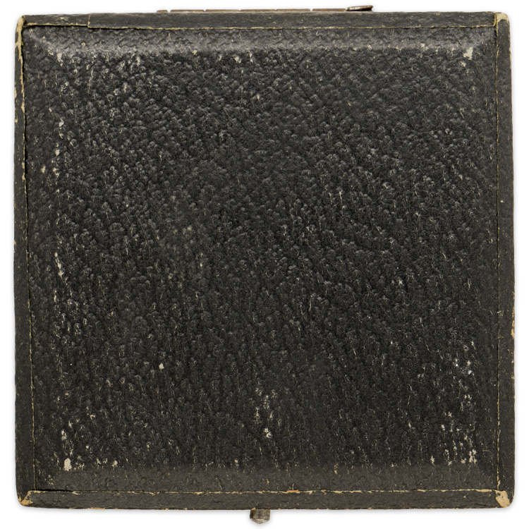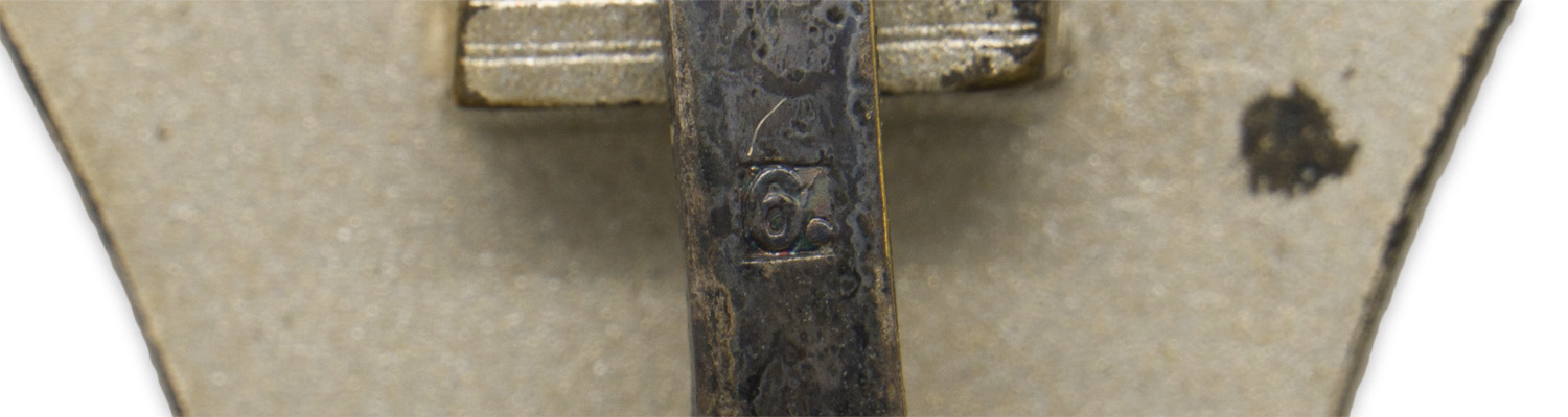 PHYSICAL DESCRIPTION: 1939 pattern, die struck, three piece, iron and alloy construction Patté style cross with a single piece iron core and two piece alloy frame. The obverse of the award features an embossed, central, canted, swastika with re-institution date, "1939", to the bottom arm. The swastika is in nice high relief while the date is somewhat lower. The award has a plain reverse. The plain reverse of the award has a solid, soldered hinge, a broad, thick, tapered, vertical pin and catch all intact. The pin is well marked with the embossed manufacturer’s numerical code within a rectangular recess "6.", indicating manufacture by Fritz Zimmermann of Stuttgart. Nice original case. The latch on the case does not seem to catch, but otherwise fine. Rare maker.