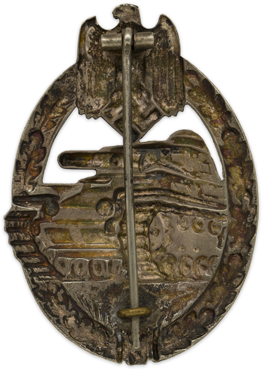 PHYSICAL DESCRIPTION: Nicely detailed, die stamped, hollow backed, alloy construction award with a nickle/silver plate. The badge is in the form of an embossed, vertically oval, oak-leaf wreath with a Wehrmacht style eagle with down-swept wings, clutching a canted swastika in it’s talons, superimposed to the top center, encompassing the cut-out, forward profile of a tank. The wreath, eagle and tank all show nice detailing. The reverse of the badge is a mirror image of the obverse and has a crimped, soldered, hinge, a thin round vertical pin and complete catch. Variant from C.E. Juncker, Berlin. Rare badge!