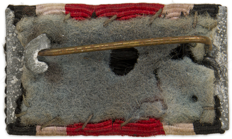 PHYSICAL DESCRIPTION: Single place ribbon bar with a horizontally ribbed, Iron Cross 2ND class ribbon featuring the German national colors with a central, vertical red stripe flanked by narrower white and black stripes. The ribbon shows age and usage toning. The ribbon is mounted on a convexed magnetic sheet metal base plate. The reverse of the base plate has a thin round horizontal pin and catch both intact.