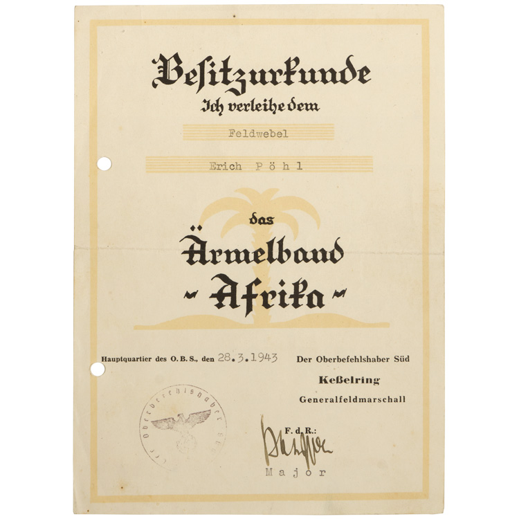 BACKGROUND: In late 1940 the Germans began the hasty formation of the DAK, Deutsches Afrikakorps, (German Africa Corps), under command of, then Generalmajor, later Generalfeldmarschall, Erwin Rommel, as an expeditionary force to assist their Italian allies in the disastrous North African campaign. The first units of the DAK arrived in Tripoli in February 1941 and under Rommel’s inspired leadership the DAK and their Italian allies were soon able to push the British back and bring some stability to the region. As a result of the German OKW, Oberkommando der Wehrmacht, (High Command of the Armed Forces), preoccupation with the invasion and battles in Russia and a lack of adequate supplies and reinforcements, the DAK would finally be defeated by the British in May 1943. Of Note: On July 18TH 1941, an "Afrikakorps" cufftitle was officially introduced for wear by personnel serving with the DAK. The "Afrika" cufftitle was introduced on January 15TH 1943 and was the second cufftitle in a series of four that held the status of a campaign award. The cufftitle was considered a military combat decoration, and as such, was bestowed with a corresponding award possession document. The basic criteria for award of the "Afrika" cufftitle, was a minimum of six months service in the African campaign, although personnel who had been wounded, contracted a tropical illness, or had won a military award, regardless of the time served in the African theatre were also entitled bestowal of the award. Of Note: With the introduction of the "Afrika" cufftitle the previously worn "Afrikakorps" cufftitle was ordered removed. Although the "Afrika" cufftitle was a campaign award most personnel who had worn the "Afrikakorps" cufftitle would have been eligible for award of the "Afrika" cufftitle. Also Of Note: The four campaign award cufftitles consisted of the "Kreta", (Crete), introduced on October 16TH 1942, the "Afrika" cufftitle introduced on January 15TH 1943, the "Metz" cufftitle introduced on October 24TH 1944 and the "Kurland", (Courland), cufftitle introduced on March 12TH 1945.