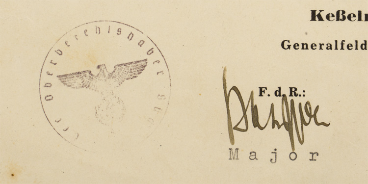 PHYSICAL DESCRIPTION: Roughly, 14cm x 20cm mid-weight paper document with black, printed script and typed in particulars. Awarded to an "Feldwebel" on "28.3.43". Two hole punched. Authorizing signature and inkstamp.