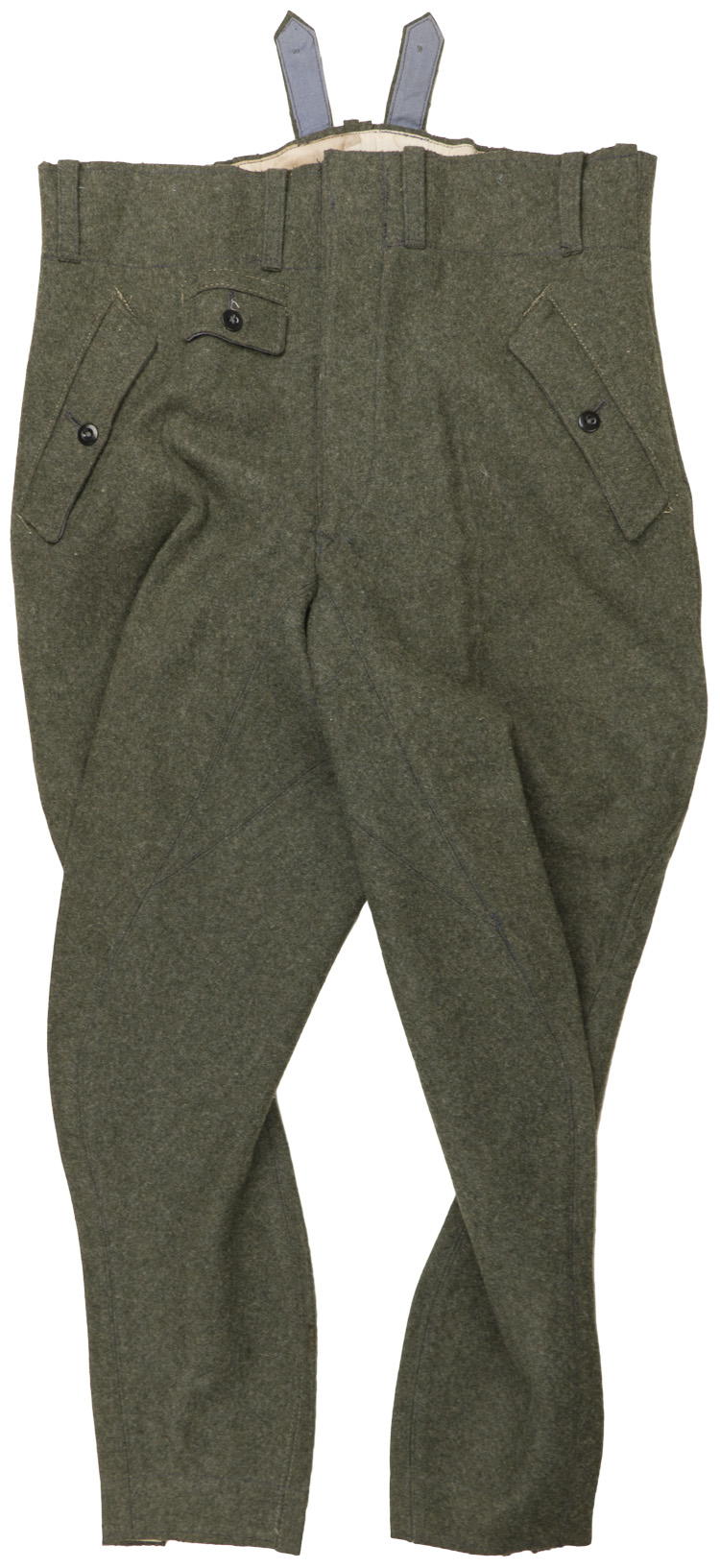 PHYSICAL DESCRIPTION: Issue style field-grey wool/rayon blend construction breeches. Buttons look to be original stitching. Roughly a 36 waist. Stain to the interior lining, but other wise very nice.