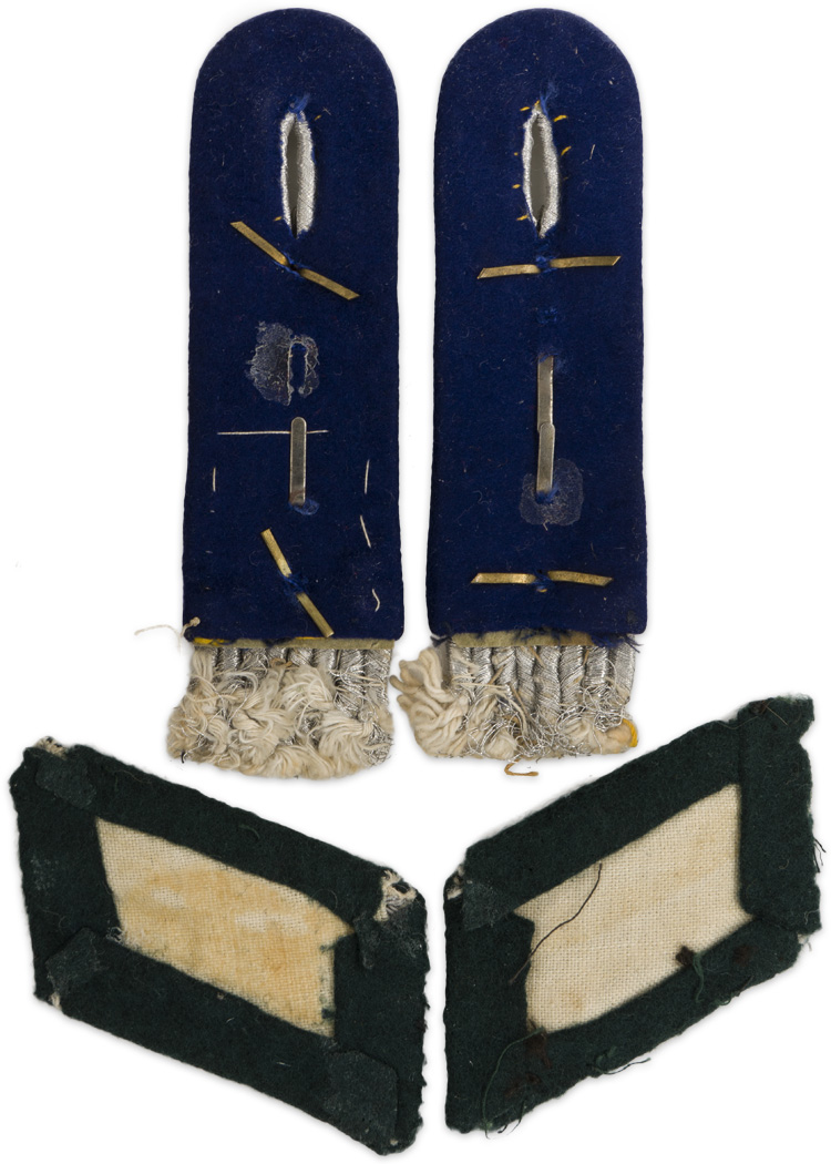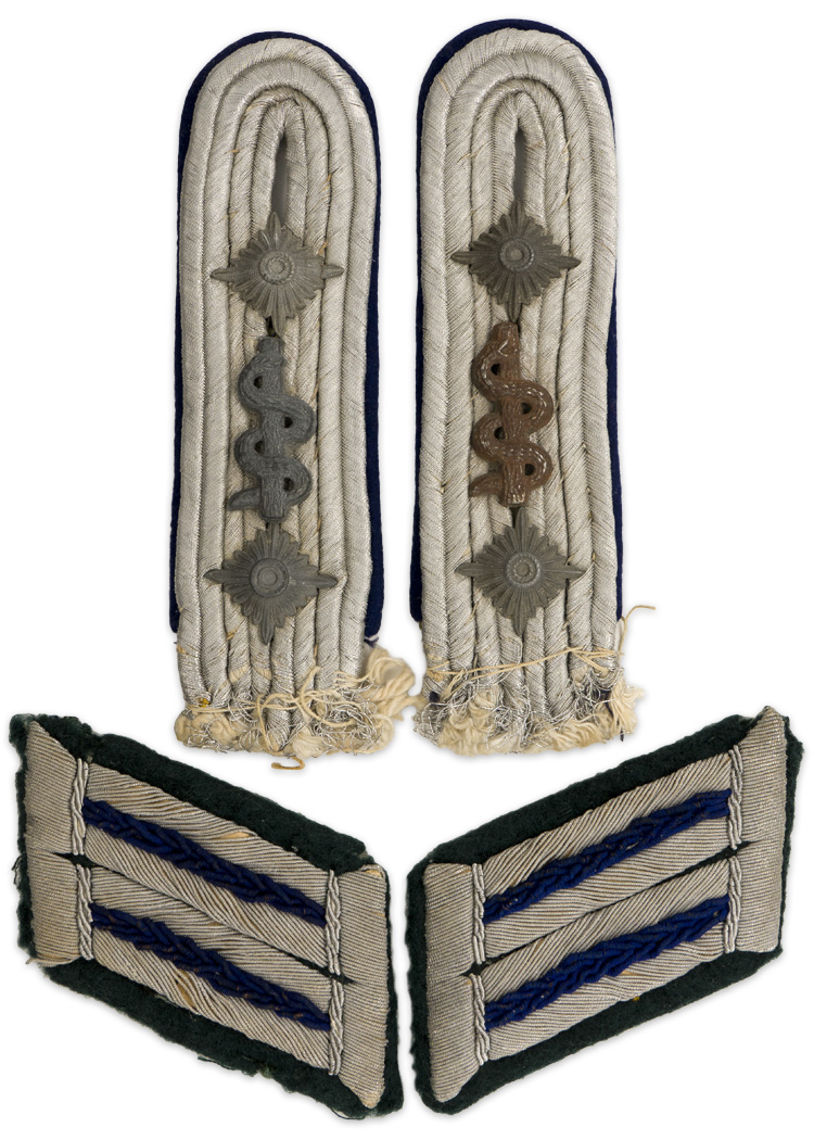 PHYSICAL DESCRIPTION: The collar tabs feature hand embroidered litzen in bright, silver/aluminum wire threads with the regulation "V" patterned, silver/aluminum "branch of service stripes", mounted on dark cornflower blue wool bases. The cornflower blue wool bases show through as the center stripe of the litzen. The collar tabs are both mounted on tan buckram backings. The sew on shoulder boards feature bright silver/aluminum Russian braid with two stamped alloy rank pips and stamped alloy, caduceus, (Serpent intertwined on a staff), medical cypher, to each, mounted on dark cornflower blue wool waffenfarbe bases with light grey wool nebenfarbe underlays. Uniform removed.