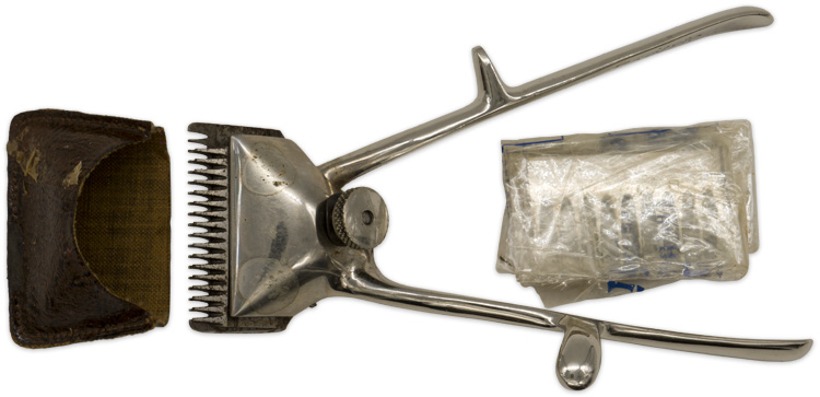A 5cm x 9cm x 15.5cm, two piece cardboard carton with friction top lid. A colour label is attached to the lid that identifies the make, model and manufacturer. To the interior is a pair of clippers with blades and leather blade cover. Unused.