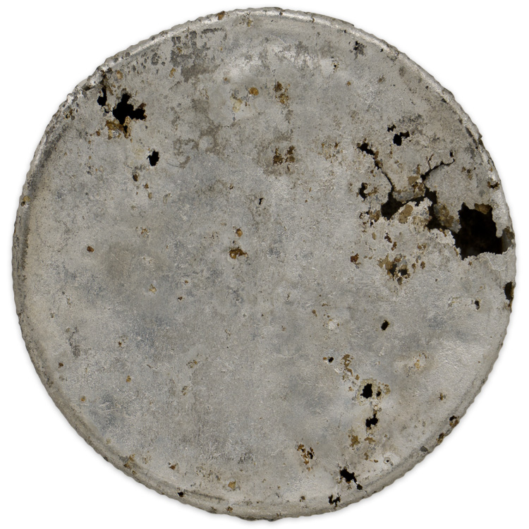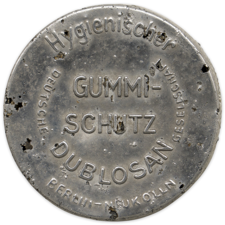 A two piece, magnetic metal alloy container with friction lid measures approximately 4cm in diameter. Originally contained a "Hygienic Protection Rubber". The top presents well, but the bottom has some corrosion and small holes through the aluminum in several spots.