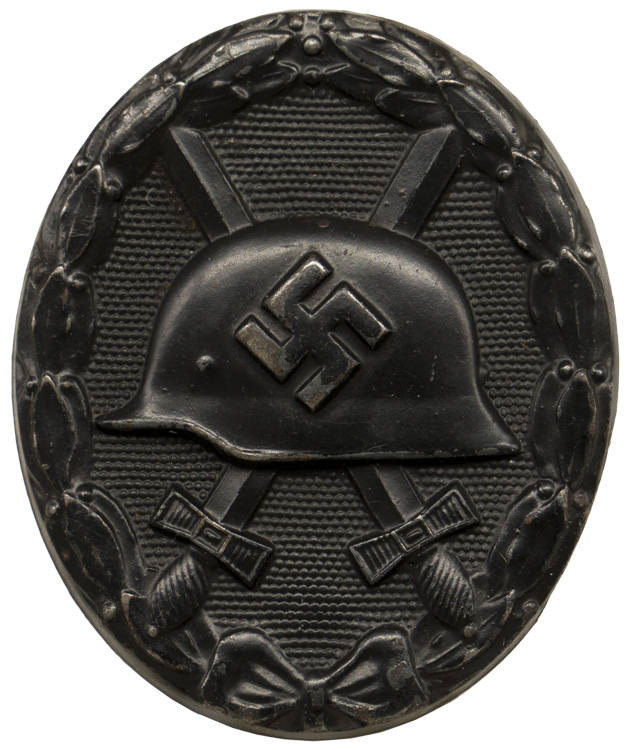 BACKGROUND: The wound badge was originally established on March 3RD 1918 by King Wilhelm II to recognise the sacrifice of those wounded during WWI. The badge was instituted in three classes, of black, silver and gold with the class bestowed reflecting the number or severity of the wounds received. On May 22ND 1939 Adolf Hitler re-instituted a slightly modified version of the wound badge with the addition of a swastika to the WWI pattern badge for award to German volunteers who had been wounded supporting the Spanish Nationalist Falangist Generalissimo Francisco Franco against the communist allied Republican Loyalist party in the Spanish Civil War. (July 1936-March 1939). With the outbreak of WWII, on September 1ST 1939, Hitler once again re-instituted another slightly modified version of the wound badge by altering the WWI pattern helmet on the badge to the newly designed M35 style helmet. The badge was awarded to both military and uniformed non-military personnel and later, (March 1943), to civilian personnel who received wounds as a result of enemy actions. The black wound badge was the lowest of the three classes and was awarded for one or two wounds.