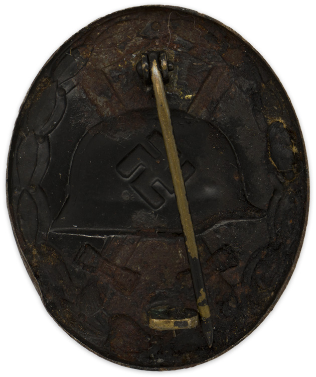 PHYSICAL DESCRIPTION: 1939 pattern, die stamped, magnetic sheet metal construction, hollow backed badge with a black wash. The badge is in the form of an embossed, vertically oval, laurel leaf wreath encompassing an embossed profile of an M35 pattern helmet with a high relief, canted, swastika to the center, superimposed over crossed swords on a pebbled base field. Complete pin and catch assembly.