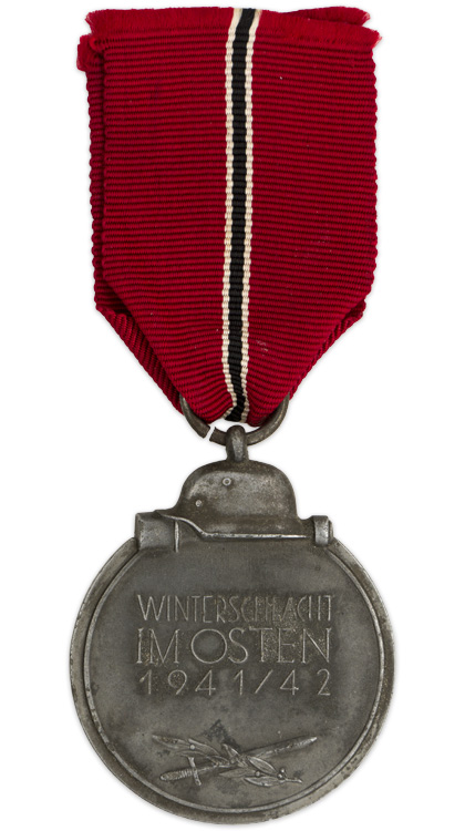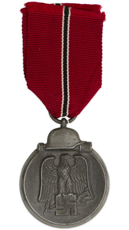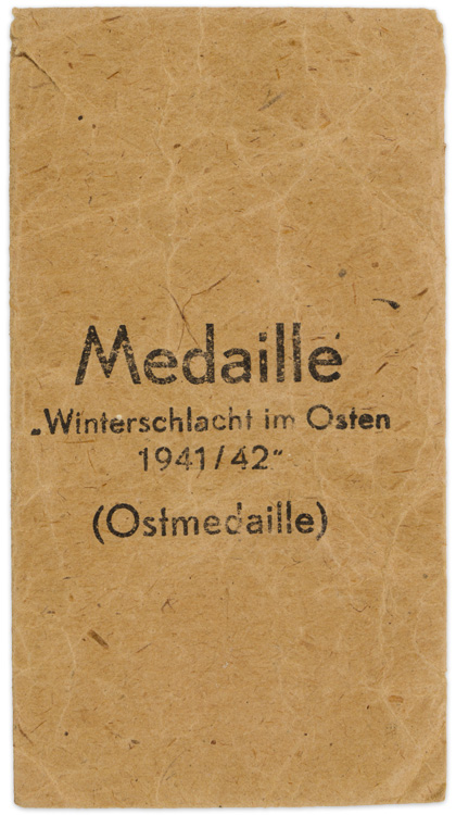 PHYSICAL DESCRIPTION: Die struck alloy award with a silver washed outer rim and helmet, and a blued center. The obverse of the medal features a recessed outer rim with an embossed helmet and grenade to the top center and a high relief Wehrmacht style national eagle with down-swept wings, clutching a static swastika which is superimposed on a laurel leaf sprig to the center. The reverse of the medal features a recessed outer rim with a smooth background field with embossed Latin script to the center, "Winterschlacht Im Osten 1941/42", (Winter Battle in the East 1941/42), positioned above a crossed sword and a laurel leaf sprig. The ribbon suspension loop and medal ring are both intact. The award comes with an original section of clean ribbed rayon ribbon. The award also comes complete with its original pinkish, light weight cardstock issue envelope with black printed block script to the obverse, "Medaille Winterschlacht Im Osten 1941/42 (Ostmedaille)".