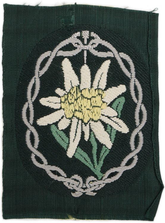 BACKGROUND: On May 2ND 1939 the Oberkommando des Heeres, (High Command of the Army), authorized wear of a distinctive Edelweiss tradition badge for Mountain Troop personnel and the design of the badge was based on a pattern worn by German Alpine troops in WWI. On introduction the badge was on a blue/green badge cloth base, but in early 1940 this was altered to a field-grey wool base. Of Note: A metal edelweiss with stem was designed for wear on the mountain cap and a stemless edelweiss was authorized for wear on the visor cap. Originally regulations, unsuccessfully, dictated the edelweiss’s were to be removed from wear if the individual was transferred out of a Mountain Troop unit. On November 12TH 1944 regulations were altered to permitted continued wear of the edelweiss after transfer out of a Mountain Troop unit as long as the individual had combat experience while serving with the Mountain Troops. Generally EM/NCO personnel utilized machine embroidered or woven sleeve edelweisses while officers ranks wore higher quality, hand embroidered edelweisses.