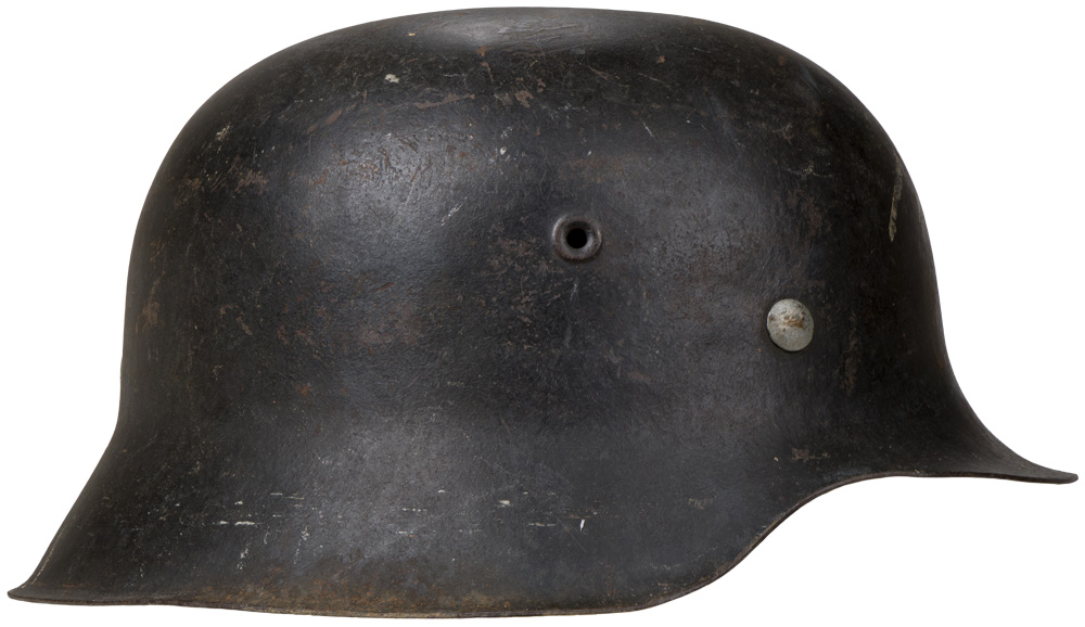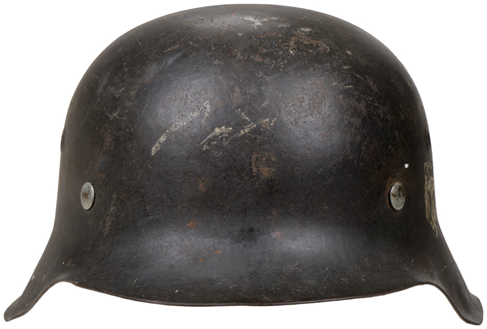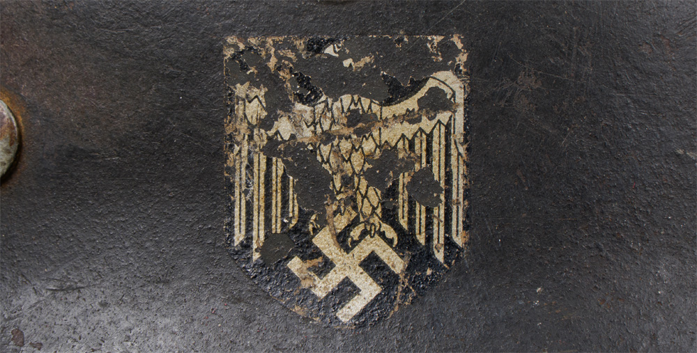 BACKGROUND: The first "modern" steel helmets were introduced by the French army in early 1915 and were shortly followed by the British army later that year. With plans on the drawing board, experimental helmets in the field, ("Gaede" helmet), and some captured French and British helmets the German army began tests for their own steel helmet at the Kummersdorf Proving Grounds in November, and in the field in December 1915. An acceptable pattern was developed and approved and production began at Eisen-und Hüttenwerke, AG Thale/Harz, in the spring of 1916. These first modern M16 helmets evolved into the M18 helmets by the end of WWI. The M16 and M18 helmets remained in usage through-out the Weimar Reichswehr era and on into the early years of the Third Reich until the development of the smaller, lighter M35 style helmet in June 1935. In an effort to reduced construction time and labor costs minor modifications were introduced in March 1940 resulting in the M40 helmet. Further construction modifications were undertaken in August 1942 resulting in the M42 helmet. Originally the Third Reich national tri-color helmet decal was introduced on March 14TH 1933 for wear on the left side of the helmet to replace the Reichswehr era state shield insignia. Regulations of February 17TH 1934 introduced the Wehrmacht eagle decal and the national tri-color decal was shifted to the right side of the helmet with the Wehrmacht eagle decal positioned on the left hand side. Regulations of March 21ST 1940 dictated that the national tri-color decal was to be removed from all helmets and further regulations of August 28TH 1943 abolished the Wehrmacht eagle decal and dictated that it was also to be removed from all helmets although the directives were not completely adhered to.