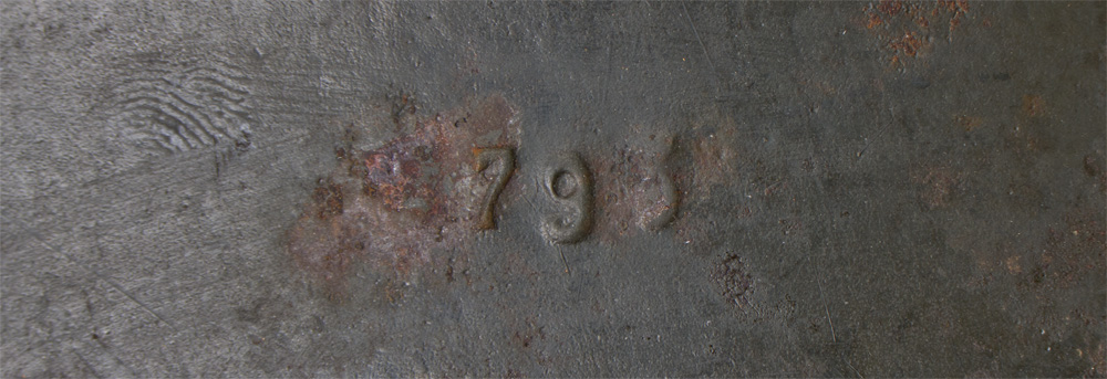 PHYSICAL DESCRIPTION: The stamped, sheet steel construction helmet retains a good portion of its slightly rough textured, age darkened field-grey paint. Wehrmacht eagle shield decal which is retained about 70%. All three liner retaining rivets are intact. The interior of the helmet has an M31 tan leather liner with all eight of its original eight fingers. Liner shows the expected period usage but is still nicely complete and original to the helmet. The interior, reverse, neck guard apron is serial/lot number stamped, "795", and the interior left side apron is stamped (very faint) with the manufacturer’s code and size, "EF64", indicating manufacture by Emaillierwerk, AG Fulda, size 64 (or maybe 66). Decent worn and used M42.