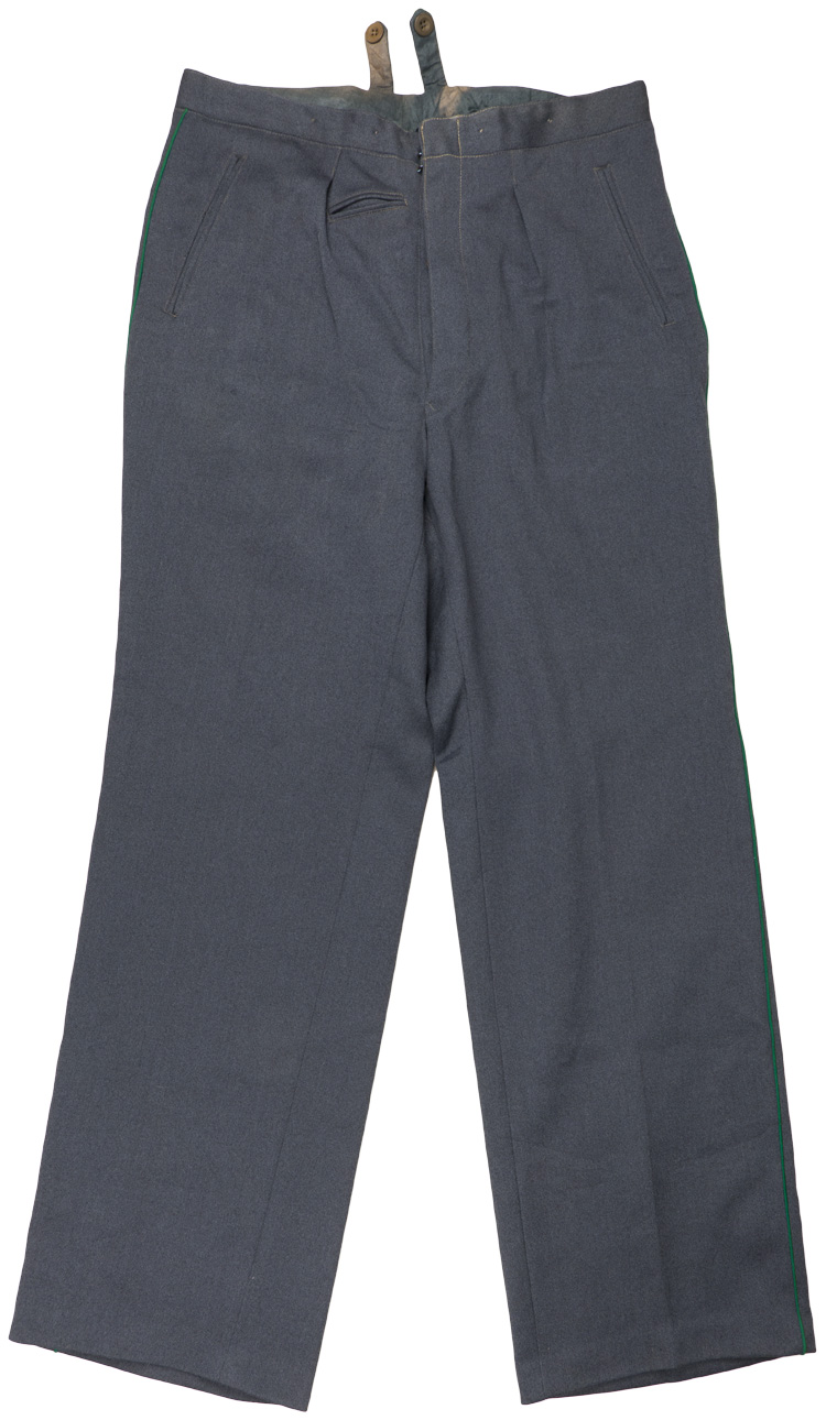 PHYSICAL DESCRIPTION: Nice quality, private purchase, pre-1940, stone grey doeskin wool construction, straight legged dress pants feature a vertical four button closure with an addition hook and eye at the waist. The vertical outside leg seams each have inserted, green wool waffenfarbe piping. The pants have straight cut, dual-ply hemmed, non-adjustable cuffs. The rear right leg/seat area has numerous prick/holes (Not visible from the front) The pants are roughly size 32" waist. All original buttons and stitching.