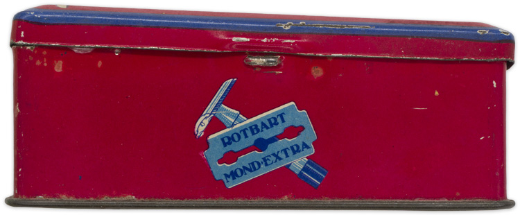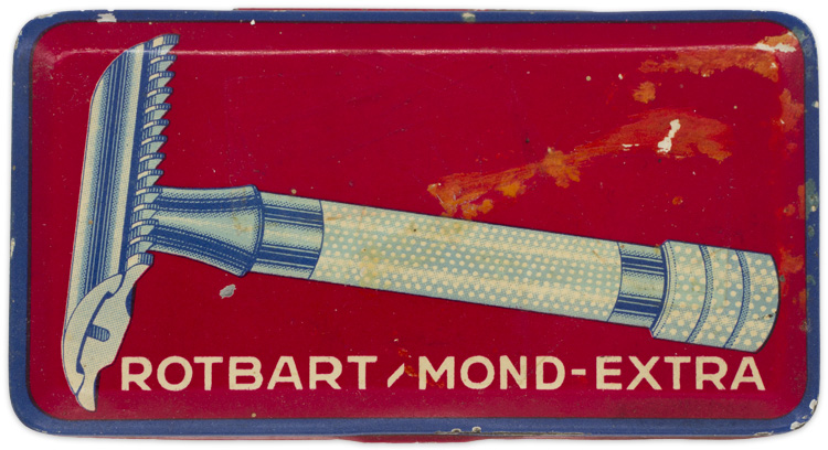 A three-piece, nickel-silver plated alloy, shaving razor in a hinged, magnetic, sheet metal constructed 9cm x 5cm x3cm case. The razor is "EMR" marked to the head of the razor, while the case is marked "Rotbart/Mond-Extra." Included is a package of ten, "Weltfunk Klinge" "Made in Germany" razor blades in their original cardboard box.