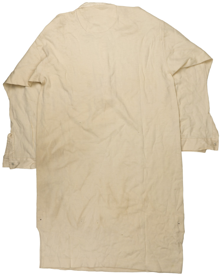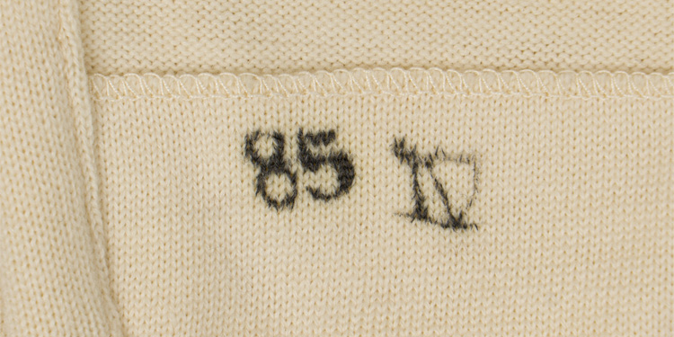 Standard issue white knit fabric undershirt with long sleeves. Size 46 stamped in black ink in the back of the neck. Three buttons are half way down. Off white cotton trim around the neck placket and wrist cuffs with typical paper buttons. Later war, circa 1943-1944, but still a high quality garment of thick knit material. Extra large size with very long body (97cm). Hard to find the issue army undershirts today. Nice example with a few moth holes and tracking present.