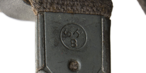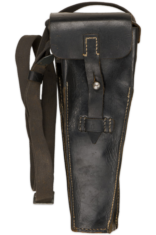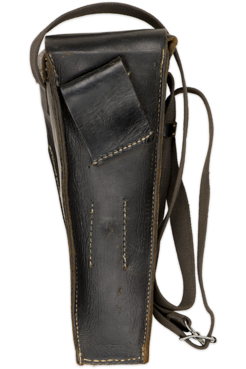 BACKGROUND: The first German WWII rifle grenade launcher was a spigot type developed in 1941 in an attempt to provide anti-tank capability to small infantry units but it proved ineffective and was discontinued in 1942. In early 1943 a second pattern, launcher cup type, rifle grenade launcher was introduced and utilized until the end of the war. At least eight different types of grenades were utilized with the launcher including anti-personnel, anti-tank, smoke, flare and propaganda leaflet grenades. The rifle grenade launcher was used with all bolt action rifles and proved to be quite efficient. When issued the K98 grenade launcher came housed in a leather or presstoff carrying pouch. Originally the pouches came with a removable shoulder strap but later models were constructed with an non-removable, integral shoulder strap.