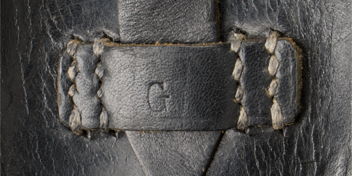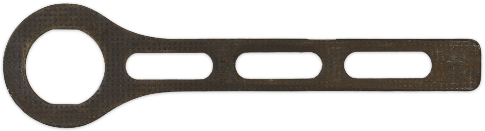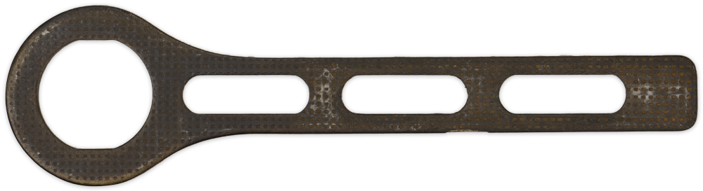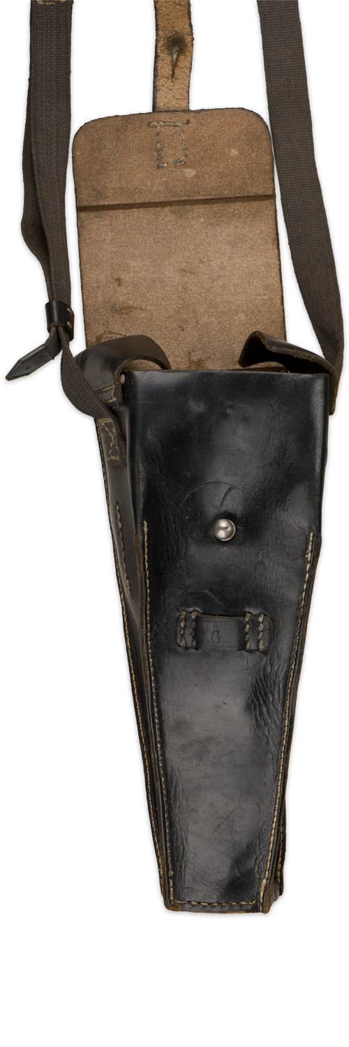 PHYSICAL DESCRIPTION: Blackened leather construction K98 grenade launcher kit pouch with an integral shoulder carrying strap. The pouch has a fold over top closure flap with a stitched on, vertical closure strap to the obverse center. The closure strap attaches to a steel stud on the front center of the pouch body, with a corresponding, stitched on, horizontal leather retaining loop. The sides of the pouch near the top edge have a stitched on canvas construction, shoulder carrying strap, with a steel gripper length adjustment buckle, a blackened leather retaining loop, and a crimped on sheet metal tipped end. The reverse of the pouch has a single, wide, diagonally angled belt loop stitched in place. The belt loop is well marked with the manufacturers three letter code and date, "dkk 42". The top opening of the pouch has internal, protective, fold down, side flaps situated beneath the top flap. The interior of the pouch has two, small, internal pockets for the assembly tool and sight. Original assembly tool is included.
