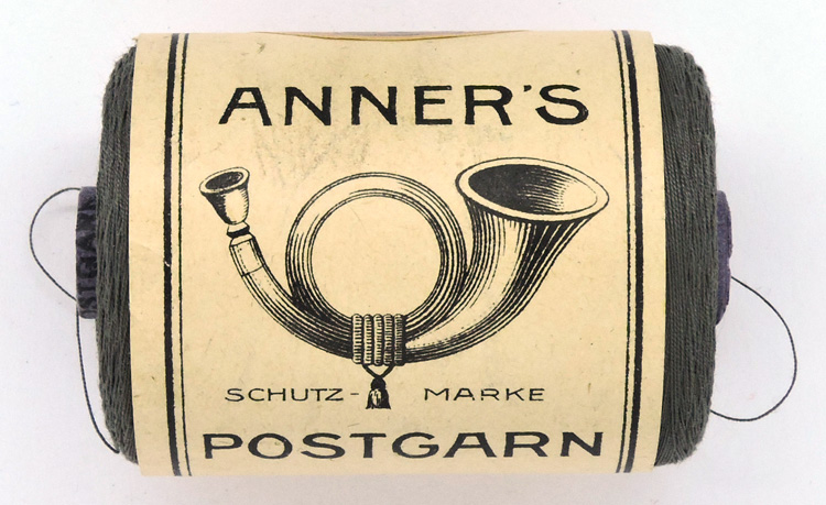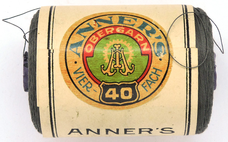 PHYSICAL DESCRIPTION: Roughly, 5.5cm tall, 4.5cm diameter, coiled blue/grey cotton thread wrapped around a hollow, pressed, natural tan cardboard construction spool. The thread still has its original, protective, light weight, paper wrapping with printed script. The spool of thread is in overall excellent, unused condition.