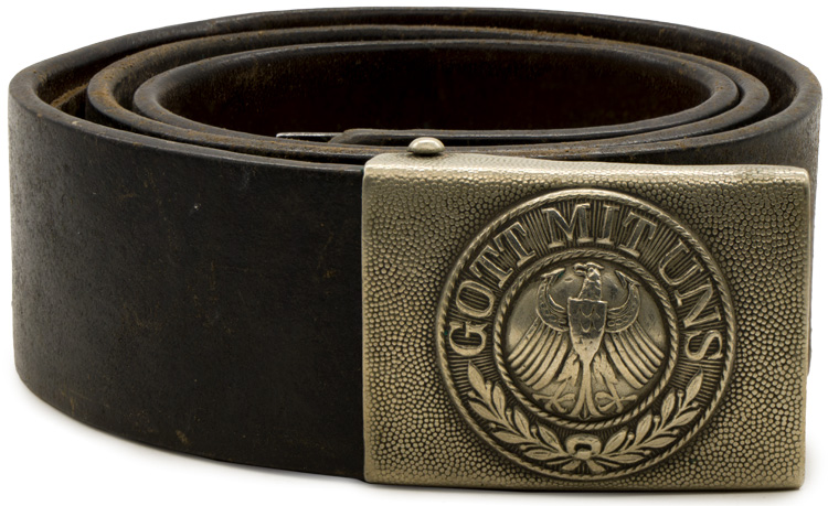 PHYSICAL DESCRIPTION: A 47mm x 62mm, die stamped, one piece, nickel/silver alloy construction, box buckle features a pebbled outer field with a high relief, embossed, Weimar style, national eagle with down swept wings, to the slightly domed, smooth finished, center, encompassed by a laurel leaf cluster to the bottom and script, "Gott Mit Uns", (God With Us), to the top. The laurel leaf cluster and script are on a ribbed background and are encircled by both an inner and outer simulated twisted rope border. The reverse of the buckle is complete with its raised catch, prong bar and prongs all intact. The buckle comes complete with an original 105cm leather belt.
