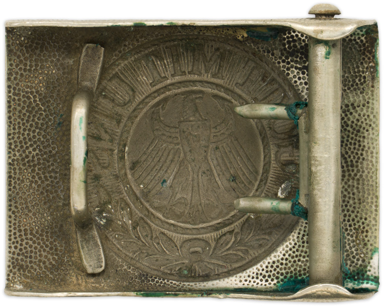BACKGROUND: Military belts and their corresponding buckles date back centuries and were initially designed for attaching swords and daggers. In 1847 a new innovative box buckle with a quick release catch and corresponding belt were introduced which resulted in a Prussian, Hauptmann Virschow, initiating a new method of carrying personal equipment with the belt and shoulder straps supporting the majority of the weight. This system, with modifications, remains in use in most of the armies in the world to this day. The Weimar era, (circa 1919 1933), Reichswehr, (National Defence {Force}), belt buckle was introduced in May 1919, for wear by EM/NCO personnel serving in both the Reichsheer, (National Army), and the Reichsmarine, (National Navy), with a different colored finish for each branch of service. Although introduced in May 1919 the belt buckle wasn’t widely distributed until 1921. The buckle retained the same basic design as the Imperial German belt buckle but replaced the Imperial crown with the newly introduced national eagle. The Reichswehr era belt buckles were most commonly manufactured in solid nickel/silver although steel buckles were also produced. Of Note: On January 24TH 1936 a new pattern EM/NCO’s belt buckle was officially introduced to replace the Reichswehr belt buckles although both were worn concurrently for a short period of time. The new pattern belt buckles retained the basic design of the Reichsheer belt buckles with the addition of the new Wehrmacht, (Armed Forces), style national eagle.