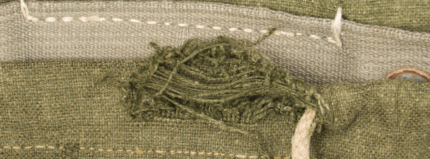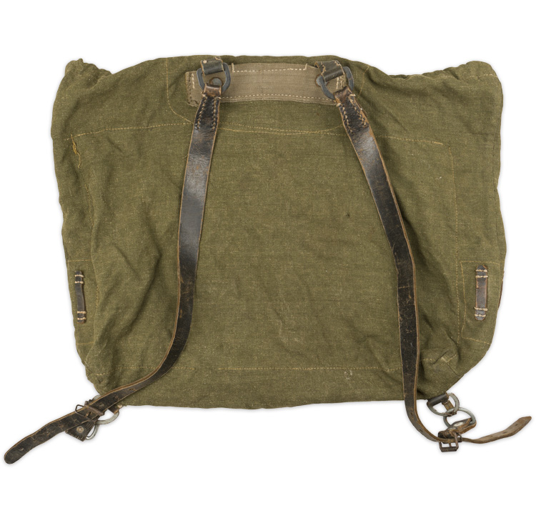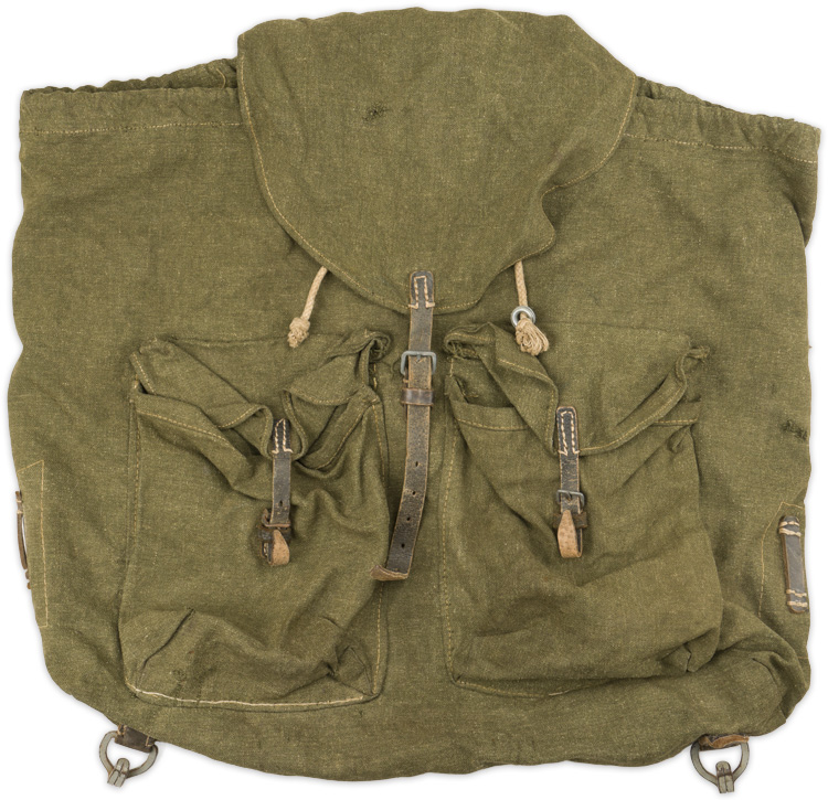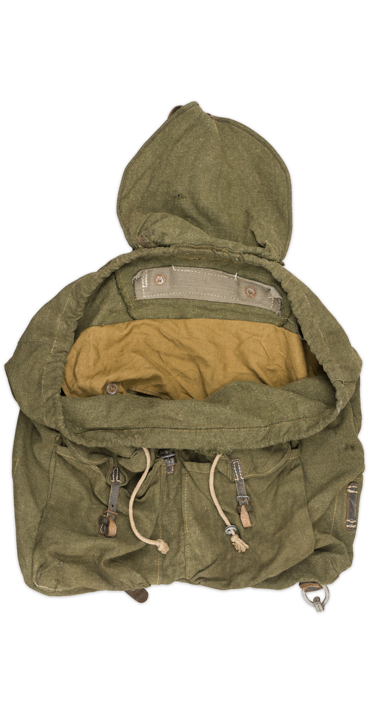 PHYSICAL DESCRIPTION: An olive drab canvas rucksack measuring approximately 53cm tall x 48cm wide x 13cm deep. All straps and attachment hooks are intact. Nice worn and used example showing the expected age and wear.