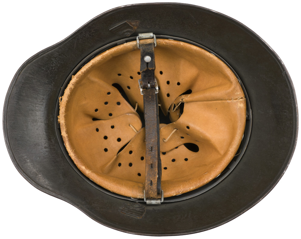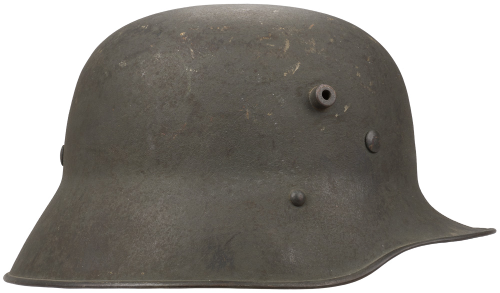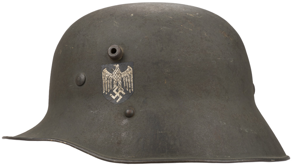 BACKGROUND: The first "modern" steel helmets were introduced by the French army in early 1915 and were shortly followed by the British army later that year. With plans on the drawing board, experimental helmets in the field, ("Gaede" helmet), and some captured French and British helmets the German army began tests for their own steel helmet at the Kummersdorf Proving Grounds in November, and in the field in December 1915. An acceptable pattern was developed and approved and production began at Eisen-und Hüttenwerke, AG Thale/Harz, in the spring of 1916. These first modern M16 helmets evolved into the M18 helmets by the end of WWI. At the end of WWI it is estimated that Germany had produced about 8,500,000 steel helmets. As a result of the restrictions placed on the German’s by the Treaty of Versailles, which dictated a standing army of only 100,000 personnel, there was an abundant surplus of these helmets, and though they saw widespread use by Freikorps personnel, there was still a stockpile controlled by the Reichswehr. These excess helmets underwent minor modifications in 1923 with the addition of provincial identifying shield decals and in 1931 with the development of a new chinstrap and liner system. Although helmet development was ongoing when Hitler came to power in 1933, the M16 and M18 helmets were still the main headgear worn by the Reichswehr. The helmets remained the same until March 1933 when the provincial shields were discontinued in favour of the national tri-color shield. In 1934 the national eagle shield was introduced, and both the tri-color and eagle shields were applied to the helmets. After the development of the new M35 helmet , the WWI helmets were still issued to second line and training troops well into WWII. The Austrian M16 was almost identical to the German version with the positioning of the chinstrap liner rivets being the most readily identifiable difference.