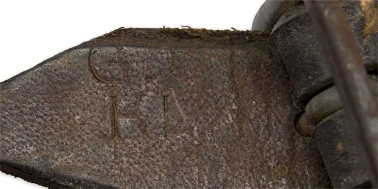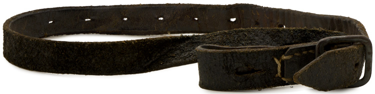 PHYSICAL DESCRIPTION: Two piece leather construction helmet chinstrap with steel fittings. Both sections and studs all complete. Maker marked.
