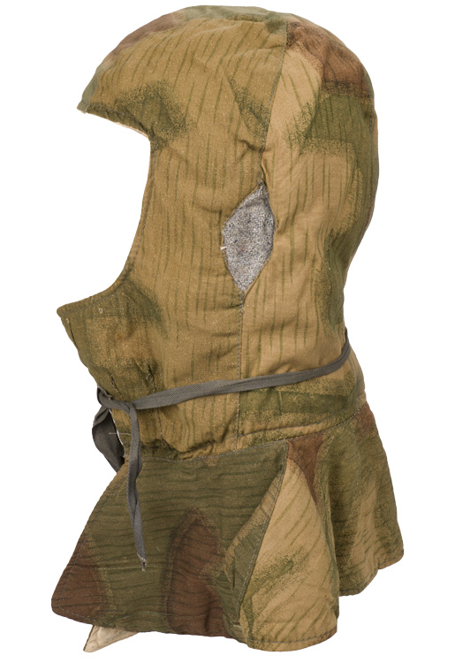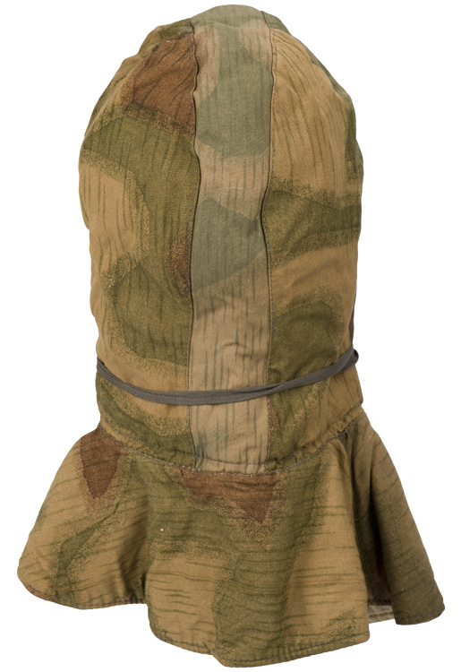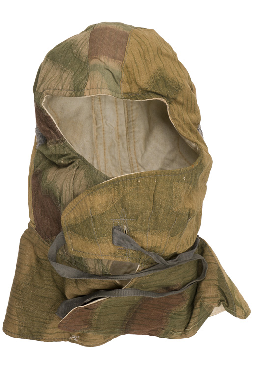 BACKGROUND: The development of camouflage clothing and equipment had began in the German army in WWI, and continued through the Weimar Reichswehr era. The geometric splinter pattern was developed in the early 1930's and was first adopted for use with the M31 quarter shelter/poncho in late 1931. Further developments in 1943 modified the original splinter pattern by softly blurring the distinct geometric pattern and slightly altering the coloration. This modified camouflage pattern was designated the Tan/water camouflage pattern and was once again altered in 1944 by an even stronger blurring of the distinct geometric pattern. Further camouflage pattern development continued through-out the war and additional subtly different patterns were created with the intent to equip all personnel with the same camouflage pattern but this was never achieved. After the devastating winter of 1941-1942 on the Russian front the German army found that it was drastically under equipped with cold weather garments to withstand the severe cold and a wide variety of improvised garments including a broad assortment of donated civilian garments were utilized as a temporary solution. To rectify the situation the OKH, Oberkommando des Heeres, (High Command of the Army), began testing heavier winter clothing in the spring of 1942 to develop suitable garments for the Russian front. In April 1942 Hitler approved the chosen designs and the first models were issued in the autumn of that year, in the reversible blue/mouse grey/white colorations, which was modified to camouflage pattern/white combinations in 1943. Included with these new garments were heavy, padded, reversible winter suits which consisted of a parka, pants and separate hoods and mittens. Of Note: These garments were also produced in non-reversible models. The winter hoods were a standard issue item and were distributed to all EM/NCO’s for the winter season, (September 15TH to April 15TH), with other winter garments and were to be returned to the units clothing depot in April for storage, repair and cleaning to be reissued the following September. Originally Officers and senior NCO’s responsible for purchasing their own uniforms and headgear were required to purchase the new winter garments until regulations of December 1942 extended the issue winter clothing to all ranks in the colder theatres of operation. Although the suits proved quite effective they were very difficult to keep clean and launder which resulted in regulations dictating that the white side was only to be worn on the exterior when absolutely necessary.