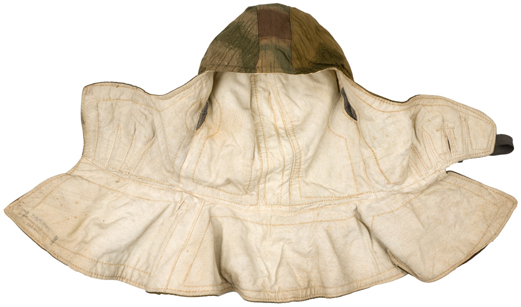PHYSICAL DESCRIPTION: Waterproofed cotton duck and cotton/rayon blend construction hood with printed tan/water pattern camouflage to one side reversible to white with an internal padding. The hood is cut in seven panels with five panels for the actual hood and an additional two panels for the neck and shoulder cowling. Each side of the hood has an elongated vertically oval ear panel which reveals the internal ersatz padding. The ear panels were designed to retain warmth while still allowing the wearer to hear. The hood has an extended, vertically darted section to the left front panel, with a small vertical slash. Complete. Maker marked.