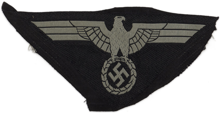 PHYSICAL DESCRIPTION: Later, M44 pattern, machine woven, national breast eagle with outstretched wings, clutching a wreathed, canted, swastika in it’s talons in matte grey rayon threads on a woven, black, inverted triangular, rayon base. The eagle’s wingspan is roughly, 3 3/4", (9.5cm), from wing tip to wing tip. The eagle is still on its original, black, rayon factory roll and is in overall very good, un-issued condition with minimal age toning and fraying to the outer edges of the black rayon factory roll.