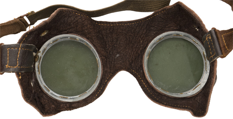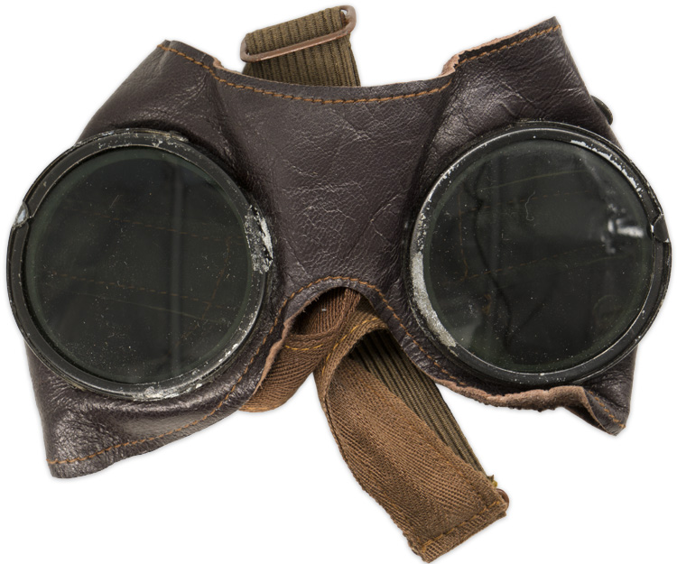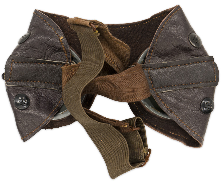 PHYSICAL DESCRIPTION: General purpose goggles with a cut-out, grained, leather frame with stitched on, circular metal alloy lens retainers. Original ventilation grommets and head strap are complete. Comes with original case.