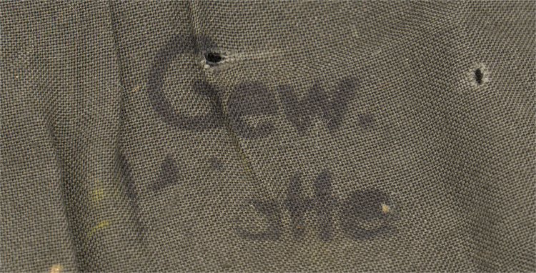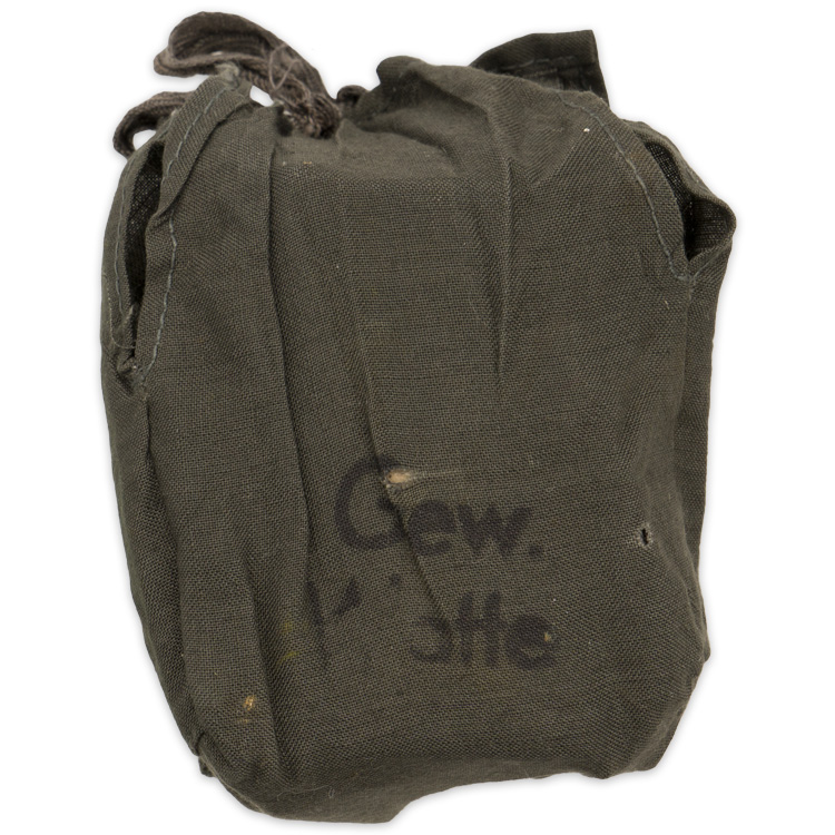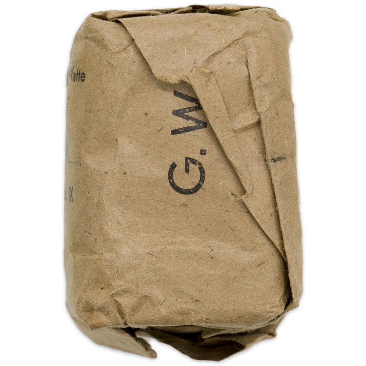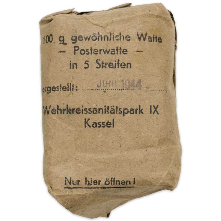 A roughly 5cm x 5.5cm x 7cm , paper wrapped package of medical wadding pads. Package is well marked with black printed script which includes contents along with a stamped date of "Juni 1944". The unopened paper package is in very nice condition. Included is a small fabric pouch with ties.