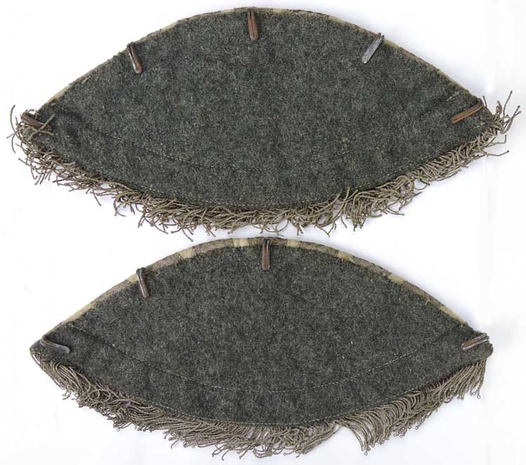 PHYSICAL DESCRIPTION: Two roughly, 10cm tall, 24cm wide, half-moon shaped, matching, Infantry drummers and fifers "swallow’s nests" consisting of a white wool waffenfarbe base with seven, alternating, evenly spaced, machine stitched, vertical, bright, silver/aluminum, diamond patterned, tress stripes and an additional, slightly curved, horizontal, bright, silver/aluminum, diamond patterned, tress stripe to the bottom edge. The white wool base shows through as a narrow, vertical stripe between each of the tress stripes. Silver fringe to the bottom of each (Officer?). The reverse of each "swallow’s nest" has a protective, feldgrau wool backing stitched in place. The reverse of the "swallow’s nests" have five (missing one), evenly spaced, sheet metal attachment hooks. The "swallow’s nests", are in overall very good condition with minor age and usage toning.