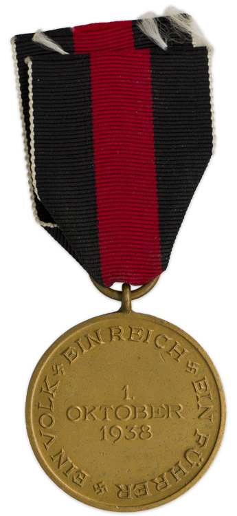PHYSICAL DESCRIPTION: Roughly, 32mm diameter, bronze washed, die struck alloy construction medal features two embossed figures symbolically breaking the chains of bondage with an unfurled national flag in the background and a high relief national eagle to the bottom of the obverse. The reverse features embossed Latin script to the center,"1 Oktober 1938", encompassed by additional script, "Ein Volk, Ein Reich, Ein Führer". (One People, One State, One Leader). The ribbon suspension ring and medal loop are both intact and the award comes complete with a piece of original ribbed, rayon ribbon.