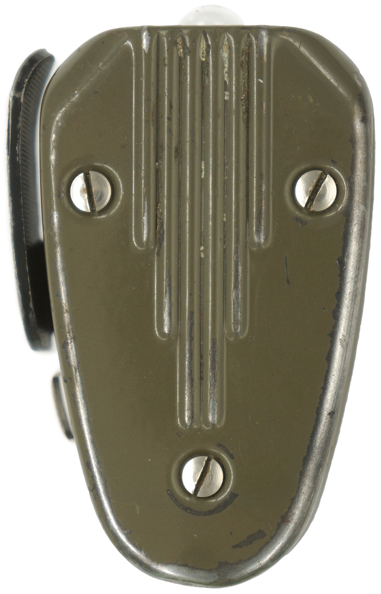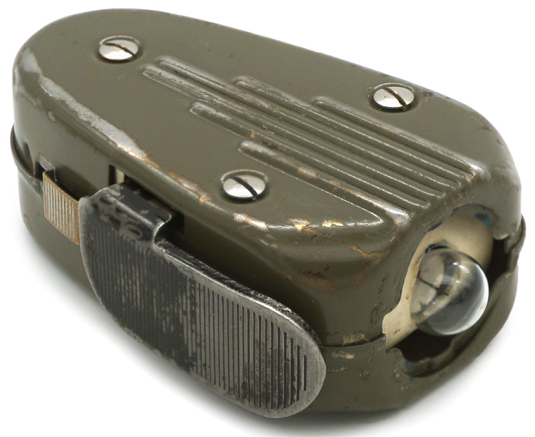 BACKGROUND: The field flashlight was a standard issue item for all ranks and German army personnel utilized a wide variety of field flashlights including both private purchase and issued models. Generally the field flashlights were equipped with assorted colored lenses for signaling and dark, "black-out", lenses for camouflage purposes. This example is the unique hand generator type that utilizes a magnetic field and kinetic energy creating an electrical current strong enough to power the light bulb. Of Note: Among other discoveries, renown British scientist/inventor Michael Faraday, (1791-1867), discovered electro-magnetic induction in August 1831 which enabled the production of these type of flashlights. Also Of Note: After the early victories in Poland and the western front Germany soon began to utilize the industrial capability of the occupied countries to make up for short falls in German production of a wide variety of armaments and assorted equipment including field flashlights. This particular example was manufactured specifically for the German armed forces by the Dutch Phillips firm during Germany’s occupation of Holland.