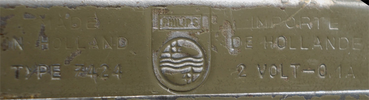 PHYSICAL DESCRIPTION: .Unique, field-grey painted, tooled and stamped magnetic sheet metal, construction hand generator flashlight with embossed, horizontal, reinforcement ribs and three screws to each side panel. The top edge of the flashlight has an "L" shaped cut-out to accommodate a black painted, steel, activation, push bar which activates an internal wheel creating an electrical magnetic current to power the light bulb. The light bulb is intact and the flashlight still functions. The forward edge of the flashlight has a circular cut-out to accommodate the light bulb. The light bulb cut-out would have had a protective glass lens but it is absent. The bottom edge of the flashlight is well marked with the impressed Phillips name and logo and additional script that includes, "Made in Holland", "Importe de Hollande", the designation, "Type 7424", voltage and amperage, "2.5Volt-0.1A". Remains in good working order.
