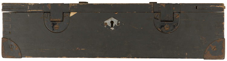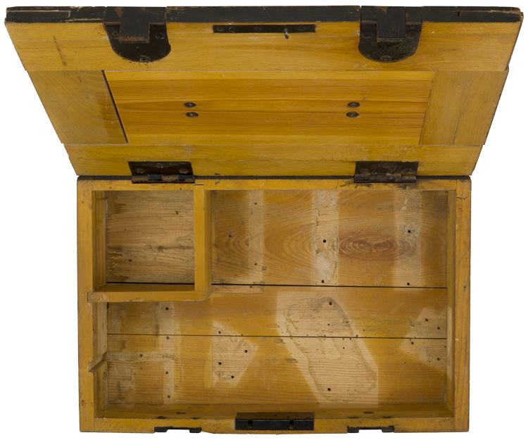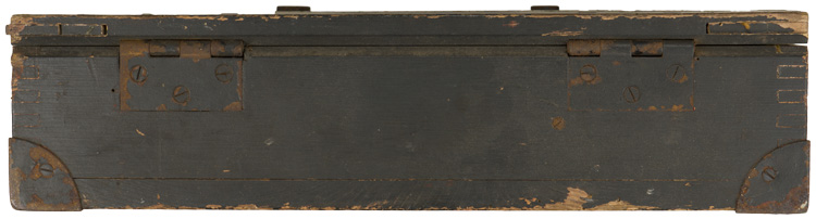 A 10cm x 26cm x 39cm painted wood crate with hinged lid and inset carrying handle inside the lid. The wooden dividers to the interior have mostly been removed. Hinges and latches work properly. Key is not included.