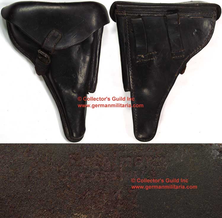 PHYSICAL DESCRIPTION: Smooth, molded, blackened leather construction hard-shell holster for the standard 4", (10.1cm), barrel P08 Luger pistol. The holster features a scalloped, fold back, top flap with a horizontal stitched seam/hinge to the reverse and a slightly diagonally angled, stitched on, closure strap to the obverse. The closure strap attaches to a leather reinforced, magnetic, pronged, roller buckle, which is stitched to the front of the holster body. The holster has a vertical, extra magazine pocket stitched to the forward edge with a semi-circular cut-out to the top edge for ease of accessing the extra magazine. The holster has an internal quick release pull strap which is inserted through a small horizontal slash on the front body of the holster. The reverse of the holster has dual, slightly diagonally angled, belt loops stitched in place. The interior of the top flap has a small, leather pocket with a steel stud closure for the quick loading tool. Faint markings. Shows age, use and period wear, but overall nice condition.