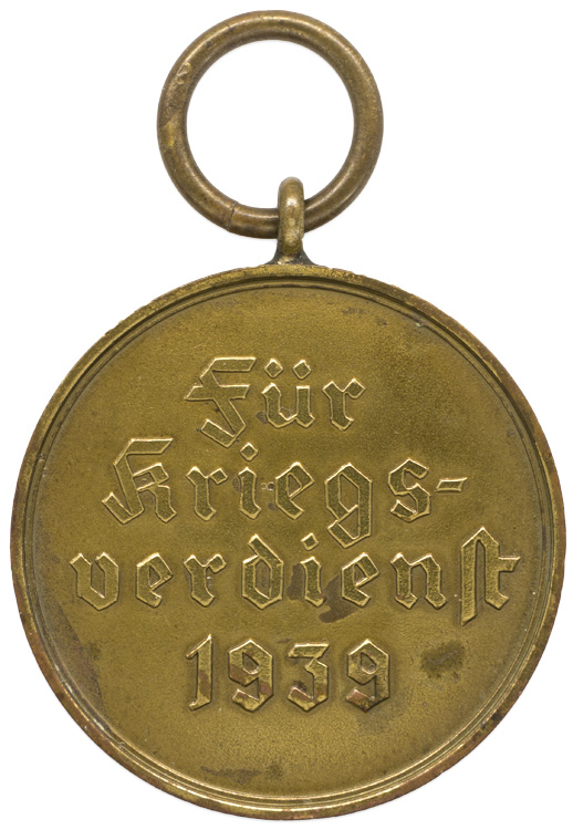 PHYSICAL DESCRIPTION: Die struck bronze alloy award with an embossed likeness of the War Merit Cross without swords to the obverse, in the form of a Maltese style cross with a circular centerpiece with an embossed, canted, swastika, encircled by a nicely detailed oak-leaf wreath. The arms of the cross have a slightly pebbled field while the background of the award is smooth with a fine raised lip to the outside edge. The reverse of the award has embossed Gothic script, "Für Kriegs-verdienst 1939", (For War Merit 1939), on a smooth background field. No ribbon.