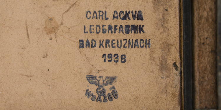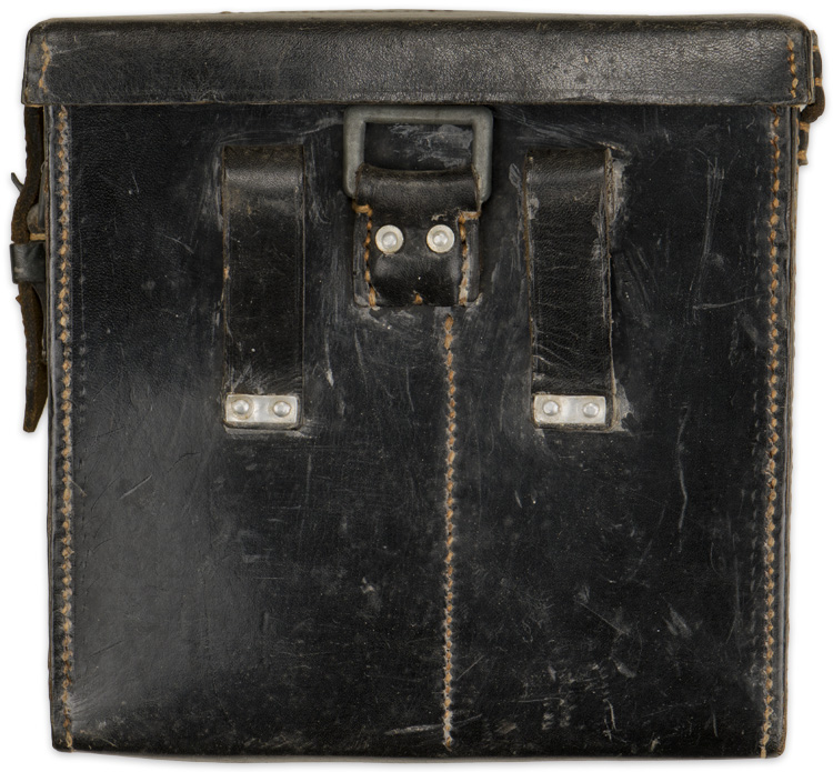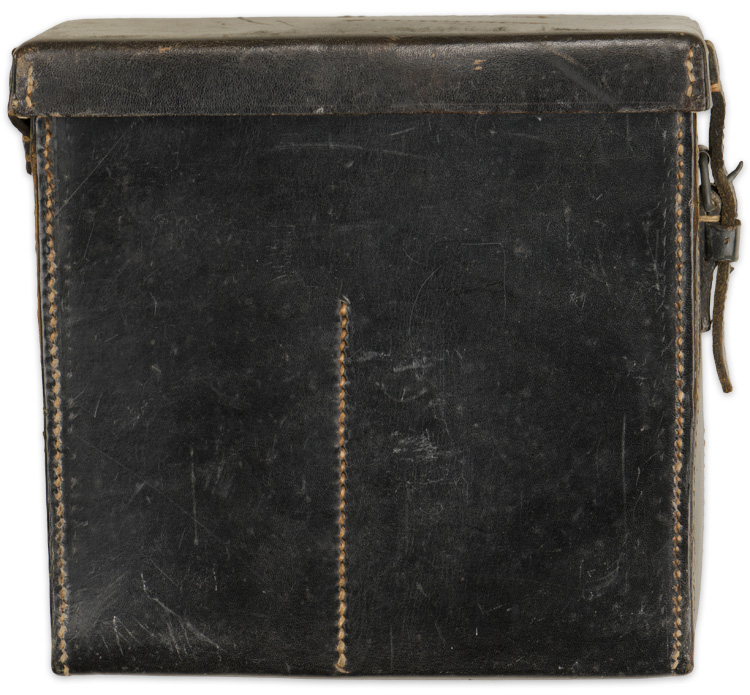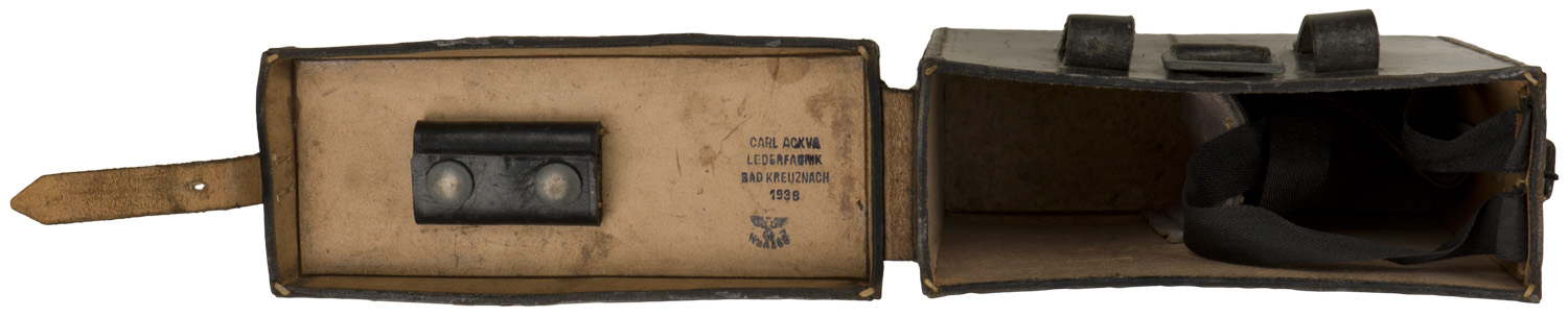 Roughly, 18.5cm tall, 19cm wide, 7cm deep, molded black leather construction pouch Brustmikrofon 33 carrying/storage case with machine stitched seams and metal fittings. The case features a fold over top lid with a machine stitched leather hinge to one side and a vertical, stitched on leather closure strap with a single buckle eyelet to the other side. The closure strap attaches to a leather reinforced, pronged, steel, roller buckle positioned on the side of the case’s body. The reverse of the case has two, rivetted on, vertical belt loops and a central, stitched and rivetted, leather reinforced rectangular steel ring. The interior of the case has three small compartments complete with grey webbing. The interior top lid has an additional small, leather loop with two, magnetic sheet metal snap closures. The interior top lid is also well marked with a Wa marking, impressed marks name and location and 1938 date. Nice complete example.