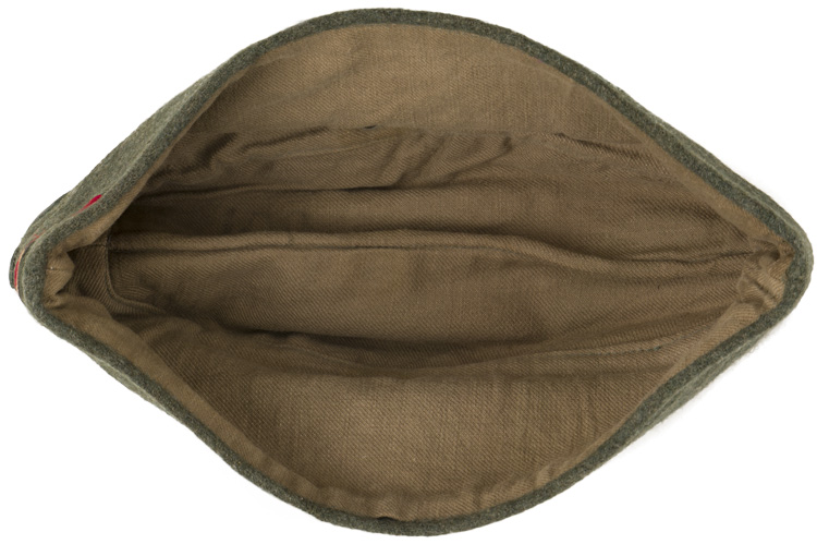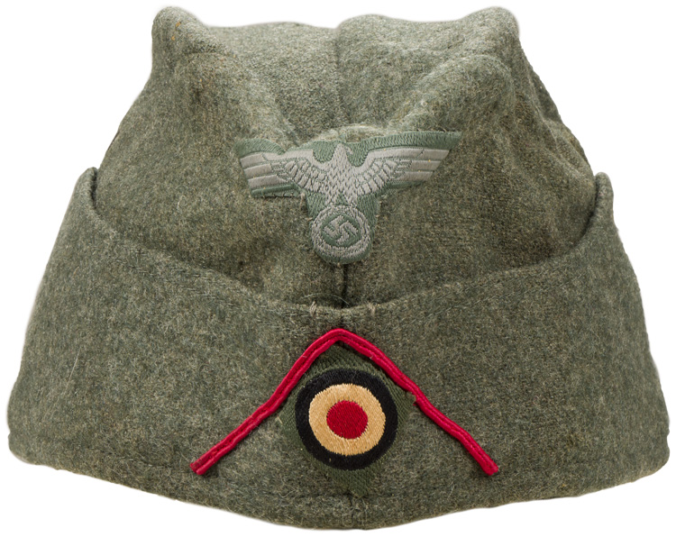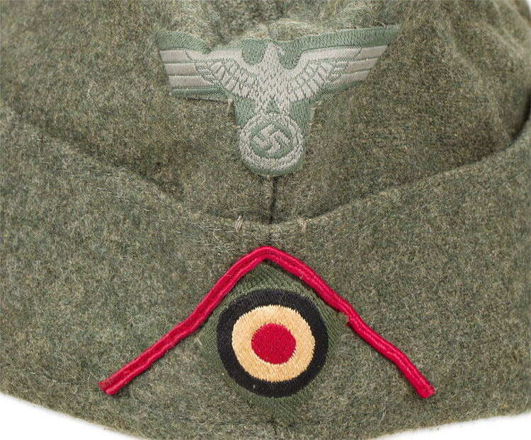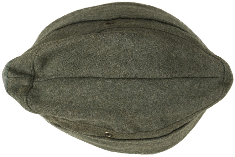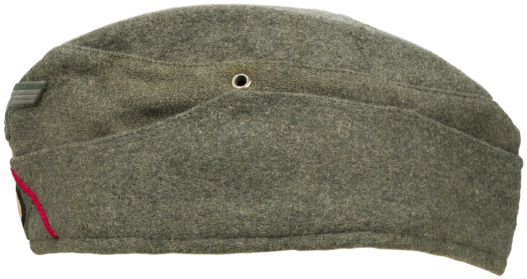 PHYSICAL DESCRIPTION: Field-grey, wool/rayon blend construction cap with fold down side and back panels with gently sloping, downward scallops to the front and forward sides. As is typical the fold down panels are handstitched in the upright position at the front center of the cap. The cap has a field-grey enamel painted, metal alloy, ventilation grommet to either side, positioned just below the crown edge. The front center of the cap has a machine woven, national eagle in pale, mouse grey, threads on a cut-out, woven, field-grey rayon base. The eagle is neatly handstitched to the cap. The front center of the fold down panels has a machine woven, national tri-color cockade, on a woven, diamond shaped, blue/green rayon base. The cockade is machine stitched to the cap. The cap has a bright red rayon, inverted, "V", soutache flanking the cockade indicating service with the Artillery. The soutache has been applied in the correct manner, being machine stitched in place and inserted through two, small, puncture holes near the bottom edge of the cap. The interior of the cap is fully lined in ribbed, brown/tan cotton/rayon blend material. No visible markings, roughly a size 60.