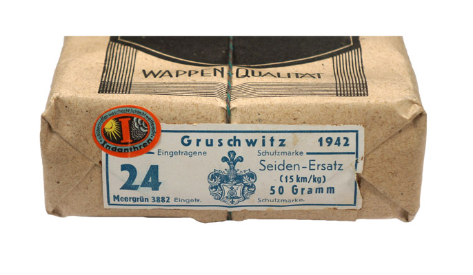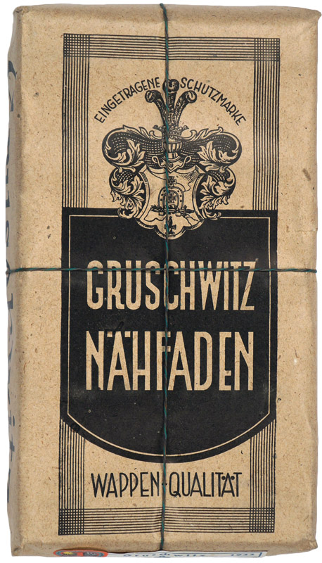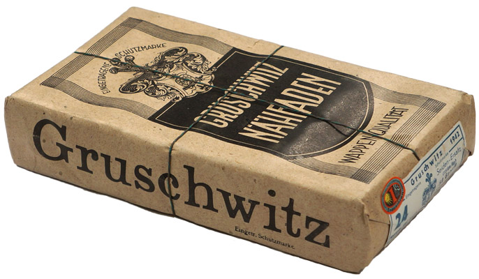 Ten rolls of feldgrau thread contained in its original paper and string wrapped factory packaging. Maker marked "Gruschwitz" and dated for 1942. Roughly 22cm x 17cm x 4cm.