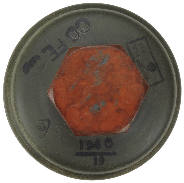 PHYSICAL DESCRIPTION: Early issue, stamped, multi-piece, magnetic sheet metal, Filter Einsatz 39, (Filter Insert 1939). The original, molded, brown bakelite screw cap cover is intact. The bottom edge of the filter has twelve embossed reinforcement ribs and a central, opened, circular air port with an inserted, protective rubber cap intact. The top edge of the filter is well marked with a faint, black inkstamped waffen-amt, the manufacturing date, "1940" and the designation, "COFE 39". Also included is the original factory cardboard packaging. Stone cold mint & nice!