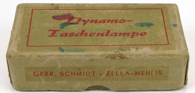 This cardstock box is for the hand-powered flashlight (Dynamo Taschenlampe) made by the firm of Gebrüder Schmidt in the German town of Hella Mehlis. Mid-1930’s, this type of flashlight was a common item with German troops and popular because it did not require batteries which were hard to get in the front lines. Scarce original box in well-used condition. The two piece box measures approximately 11cm x 3cm.
