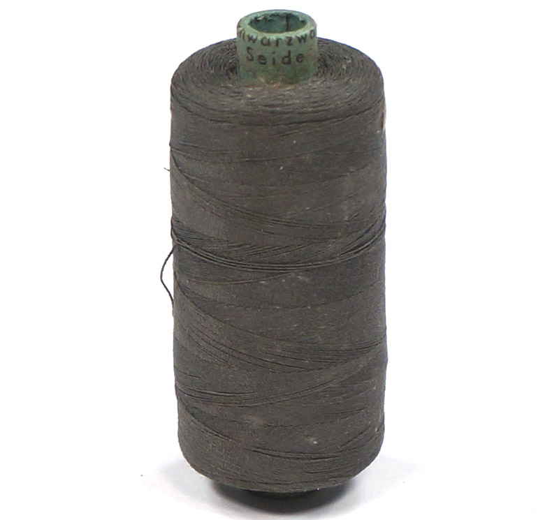 PHYSICAL DESCRIPTION: Roughly, 7.5cm tall, 3.5cm diameter, coiled feldgrau cotton thread wrapped around a hollow, pressed, natural tan cardboard construction spool. The spool of thread is in overall excellent, unused condition.