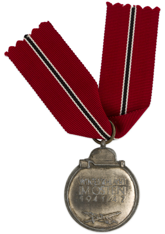 PHYSICAL DESCRIPTION: Die struck, alloy construction, medal with a silver washed outer rim and helmet, and a blued center. The obverse of the medal features a recessed outer rim with an embossed helmet and stick grenade to the top center and a high relief Wehrmacht style national eagle with down swept wings, clutching a static swastika in its talons which is superimposed on a laurel leaf sprig to the center. The reverse of the medal features a recessed outer rim with a smooth background field with embossed Latin script to the center, "Winterschlacht Im Osten 1941/42", (Winter Battle in the East 1941/42), above a crossed sword and laurel leaf sprig. The medal loop and the ribbon suspension ring are both intact. The cross comes complete with a piece of original ribbed rayon ribbon.