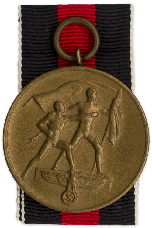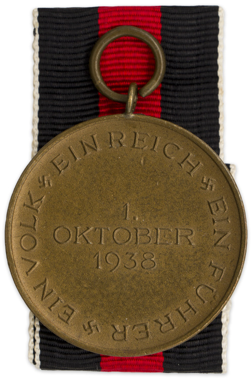 PHYSICAL DESCRIPTION: Roughly, 32mm diameter, bronze washed, die struck alloy construction medal features two embossed figures symbolically breaking the chains of bondage with an unfurled national flag in the background and a high relief national eagle to the bottom of the obverse. The reverse features embossed Latin script to the center,"1 Oktober 1938", encompassed by additional script, "Ein Volk, Ein Reich, Ein Führer". (One People, One State, One Leader). The ribbon suspension ring and medal loop are both intact and the award comes complete with a piece of original ribbed, rayon ribbon.