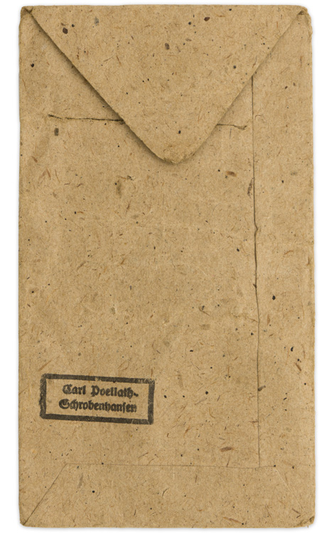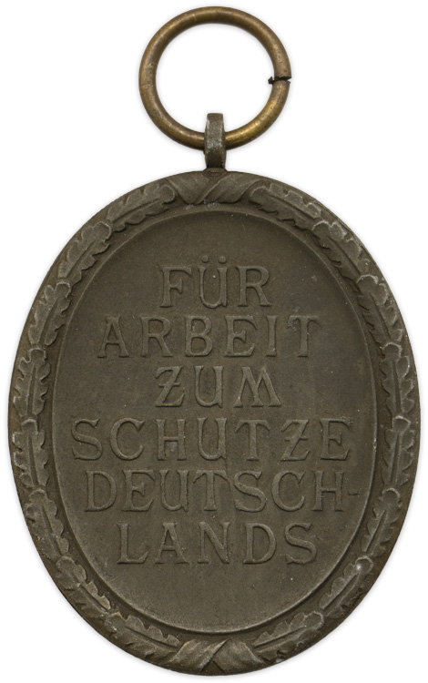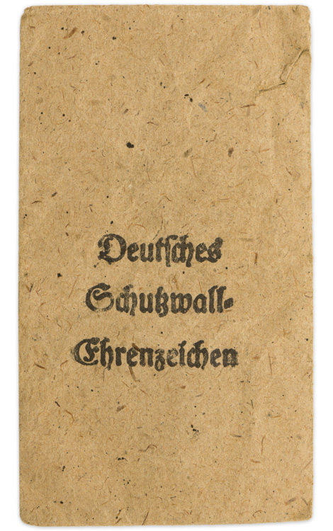PHYSICAL DESCRIPTION: Die struck, zinc construction medal with a bronze wash is in the form of a vertical oval with an embossed, oak-leaf wreath edging encompassing a smooth field with an embossed national eagle with out-stretched wings, clutching a wreathed, canted swastika in its talons, positioned above a crossed spade and sword which are in turn positioned above a pillbox to the obverse. The reverse also has the embossed, oak-leaf wreath edging which encompasses embossed, Latin script, "Für Arbeit zum Schutze Deutschlands", (For Work on the Defenses of Germany), on a smooth background field. The medal loop and the ribbon suspension ring are both intact but the ribbon is absent. The medal has no visible manufacturer’s markings. Comes complete with a light weight, natural tan cardstock, issue envelope with black printed Gothic script in three lines to the obverse, "Deutsches Schutzwall-Ehrenzeichen", (German Defense Wall Honor Award). Top edge of the envelope has a fold over, triangular flap which inserts into a horizontal slash on the envelops reverse for secure closure. Reverse of envelope has black printed Gothic scripted manufacturer's name and location, "Carl Poellath Schrobenhansen".