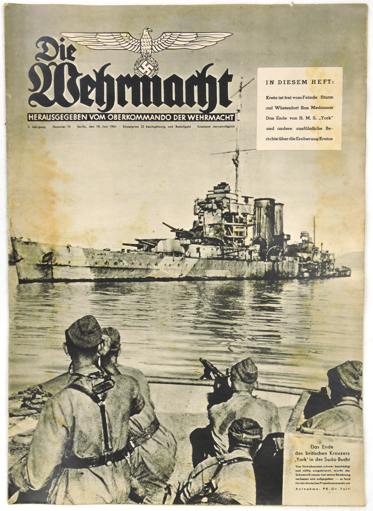BACKGROUND: "Die Wehrmacht", (The Armed Forces), magazine was originally founded in October 1935 as the, "Das Ehrenkreuz", (The Honor Cross), magazine published in Berlin by Brunnen Verlag under the auspices of the OKW, Oberkommando der Wehrmacht, (High Command of the Armed Forces), as the official magazine of the German Armed Forces. In October 1936 it was decided to rename the magazine, Die Wehrmacht with the first copy being issued on November 6TH 1936. The renaming of the magazine also brought about some reorganization with its own new publisher Verlag Die Wehrmacht and control of the magazine was passed to the Reichskriegsministerium, (National War Ministry). Die Wehrmacht was published twice a month up until the fall of 1944 with roughly two hundred different issues and at least five special issues being produced. Die Wehrmacht was distributed in eighteen different countries besides Germany including, Holland, Denmark, Belgium, France, Finland, Norway, Sweden, Switzerland, Hungary, Romania, Bulgaria, Croatia, Serbia, Slovakia, Italy, Greece, Spain and Portugal, but was only produced in the German language unlike its counterparts as Der Adler, and Signal magazines. Of Note: Although most issues of Die Wehrmacht have the printed phrase, "Erscheint vierzehntäglich", (Appears/Issued every fourteen days), we have had numerous issues with dates of only seven days apart.